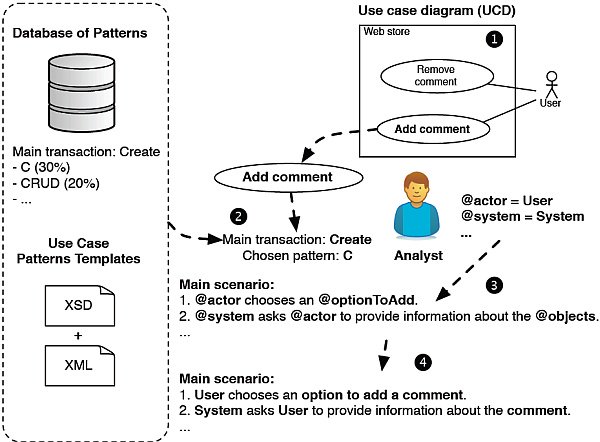 Nasza idea szkicowania przypadków użycia jest przedstawiona na diagramie po prawej stronie. Pokazuje on sposób tworzenia specyfikacji wymagań za pomocą naszego rozwiązania. Najpierw (1), analityk przygotowuje diagram przypadków użycia (lub identyfikuje przypadki użycia w inny sposób), który zawiera tytuły wszystkich przypadków użycia. Następnie (2) za pomocą narzędzia, które implementuje naszą metodę (np. UC-Sketch), każdy przypadek użycia jest szkicowany za pomocą najlepiej pasującego wzorca. W celu utworzenia przypadku użycia, analityk musi wprowadzić specyficzne dane (3) takie jak wartości parametrów. Cały proces jest półautomatyczny, gdyż użytkownik musi zaakceptować wzorzec przypadku użycia i moze dokanać edycji każdego jego elementu. Na koniec (4), analityk otrzymuje szkic przypadku użycia, który może być traktowany jako podstawa pod dalsze opracowywanie.